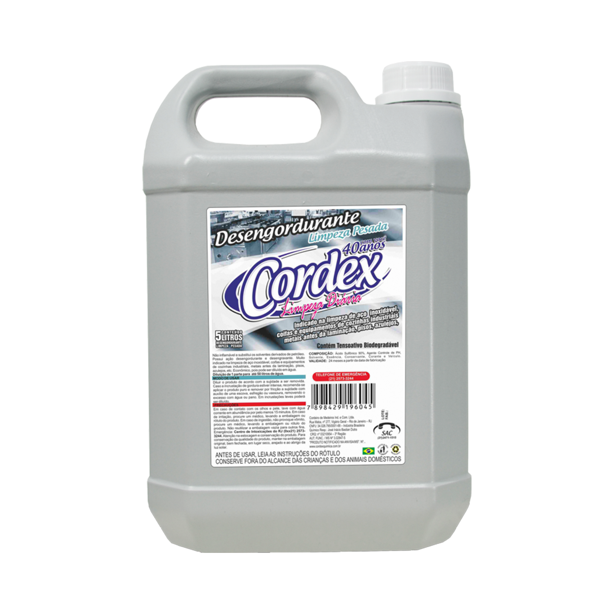O Desengordurante Cordex 5L é uma solução concentrada de alto desempenho, ideal para a remoção de gorduras, óleos e sujeiras incrustadas em diversas superfícies. Com ação desengordurante e desincrustante, este produto é amplamente utilizado em cozinhas industriais, oficinas, garagens e ambientes industriais. Especificações Técnicas: Capacidade: 5 litros Composição: Produto concentrado com pH alcalino Embalagem: Galão plástico reciclável Registro: Produto notificado na ANVISA Aplicações Sugeridas: Limpeza de Cozinhas Industriais: Coifas, chapas, pisos e utensílios de aço inoxidável. Ambientes Industriais: Metais antes da laminação, pisos e azulejos. Oficinas e Garagens: Pisos oleosos e graxentos. Caixas de Gordura: Remoção eficiente de óleos e graxas acumuladas. Destaques: Alta Eficácia: Remove rapidamente gorduras e sujeiras difíceis. Versatilidade: Adequado para uso em diversas superfícies e ambientes. Segurança: Não inflamável, substitui solventes derivados do petróleo. Economia: Embalagem de 5 litros proporciona alta durabilidade e rendimento. Modo de Usar: Limpeza Pesada: Utilizar o produto puro sobre a superfície a ser limpa. Limpeza Geral: Diluir 1 parte do produto para 20 partes de água. Limpeza Leve: Diluir 1 parte do produto para 50 partes de água.