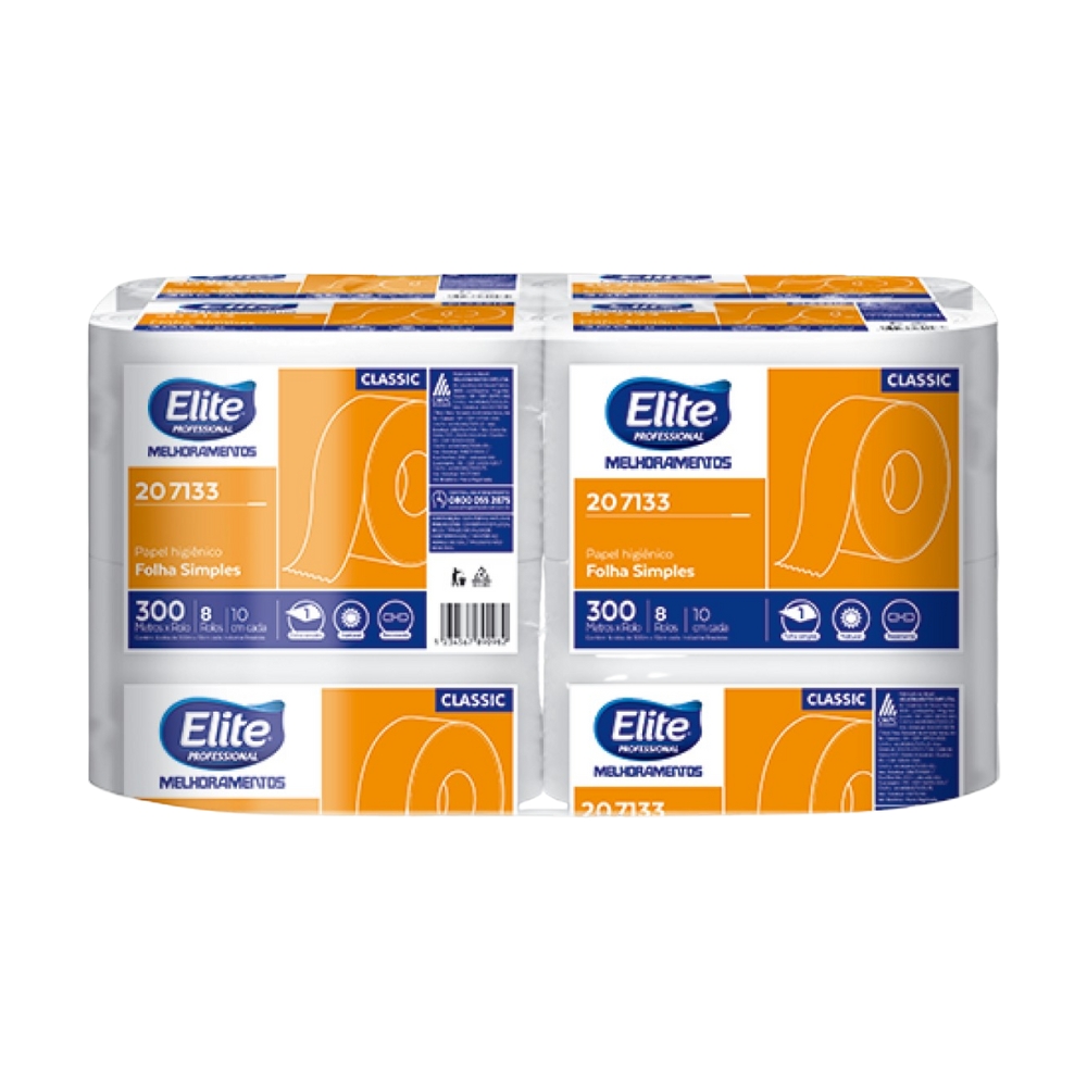 Papel Higiênico Rolo Classic 8 Rolos Folha Simples 300 M Quando falamos de Elite Professional, você está diante de toda tradição e qualidade da Melhoramentos, só que ainda mais ELITE. Com soluções profissionais de higiene para o seu negócio. O Papel higiênico CLASSIC em rolo folha simples possui coloração extra branca, foi desenvolvido para quem busca máxima eficiência em uso, trazendo satisfação aos usuários. Rendimento: Sua embalagem compacta possui 8 rolos de 300 metros cada, é preciso 0,50 cm de folha para um uso eficiente, garantindo em torno de 4000 utilizações por embalagem. Trazendo redução de tempo dedicado ao abastecimento. É um papel descartável, portanto evita o acúmulo de germes e a transmissão de bactérias e vírus que são nocivos à saúde. É indicado para toaletes em geral, especialmente para locais de alto fluxo, por exemplo: Aeroportos, shoppings, hospitais, bares e restaurantes, cinemas, escolas, dentre outras. Produto possui os selos de qualidade e sustentabilidade: FSC e a ISSO 9001
